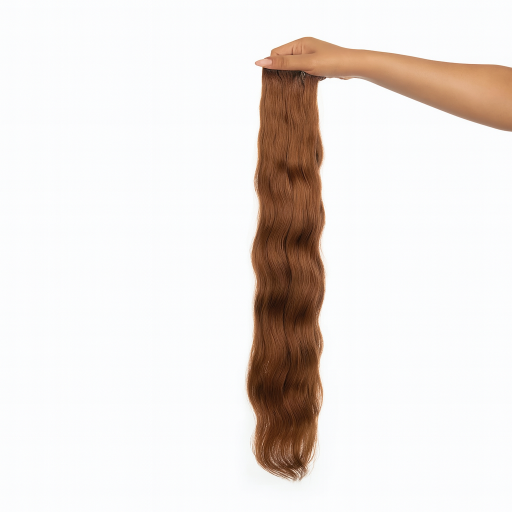 Our raw hair is transformed into Caramel Éclat, a custom-colored weft extension showcasing a rich, golden caramel tone with a warm, radiant finish. Expertly colored to perfection, this versatile shade adds depth and dimension to your look while maintaining the premium quality, volume, and authenticity that define Lux Lash & Hair extensions.