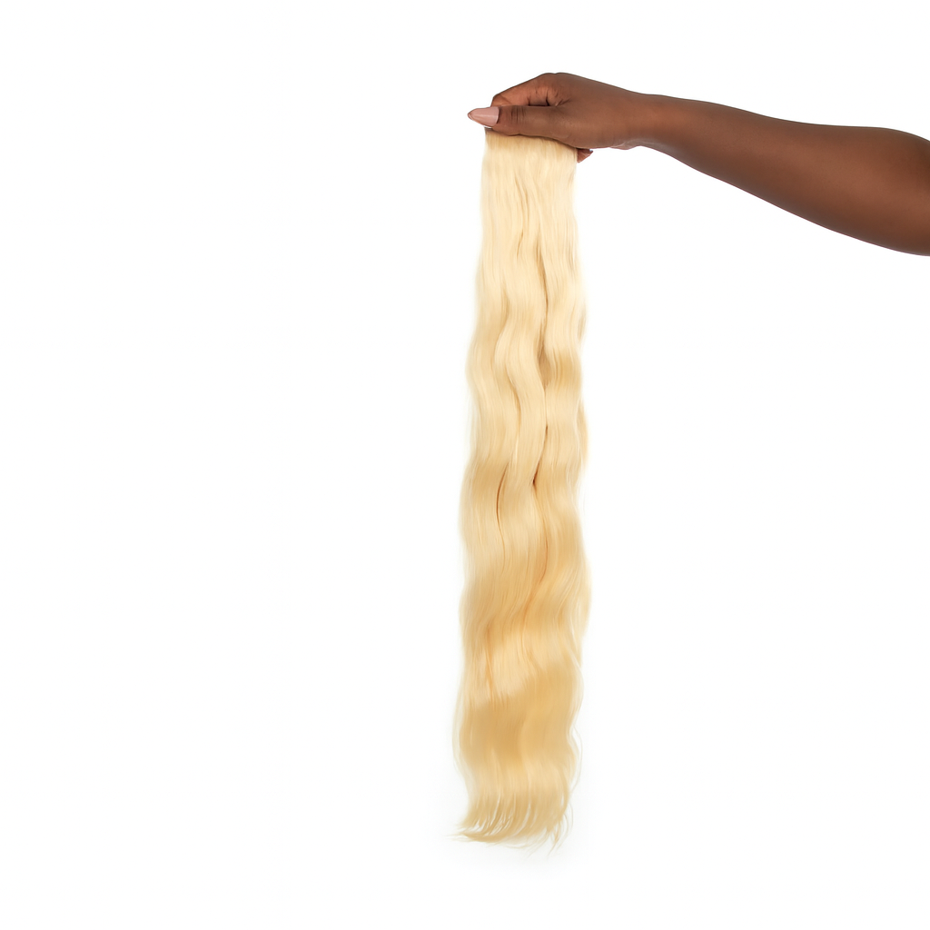 Our raw hair is transformed into Champagne Creme, a custom-colored weft extension featuring a soft, creamy platinum blonde tone with a radiant, polished finish. Professionally colored for a refined look, this luminous shade enhances your style while maintaining the premium quality, volume, and authenticity that define Lux Lash & Hair extensions.
